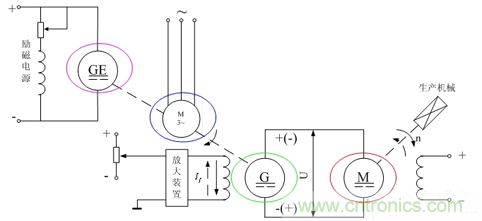 圖中,交流電動機(圖1中的藍色圈顯現(xiàn))為原動機,工作時轉速基本恒定。由它拖動的直流發(fā)電機G(圖-1中的綠色圈顯現(xiàn)秒)給需要調速的直流電動機M(圖1中的紅色圈顯現(xiàn))的電樞供電。GE(圖1中的紫色圈顯現(xiàn))為一臺小型直流發(fā)電機,可以如圖那樣與交流電動機、直流發(fā)電機G同軸相連,也可另設一臺小型交流電動機對其拖動。它在系統(tǒng)中的作用是提供一小容量的直流電源,供直流發(fā)電機G(圖1中的綠色圈顯現(xiàn))和直流電動機M(圖1中的紅色圈顯現(xiàn))的定子勵磁用,所以又稱GE為勵磁發(fā)電機。