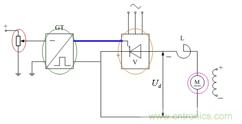 改變GT的輸入信號(圖2中的紅色圈顯現(xiàn))大小,就可改變其輸出脈沖(圖2中的藍色線條顯現(xiàn))的相位,不同相位的脈沖輸入整流器V,可以使整流器的輸出電壓Ud的大小發(fā)生變化,進而改變電動機M的轉速。