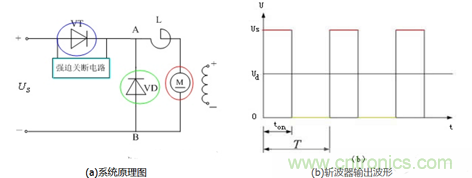 圖3中(a)圖為采用晶閘管做開關的直流斬波器—電動機調速系統(tǒng)原理圖。