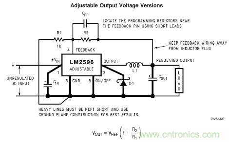 DC-DC開關(guān)穩(wěn)壓電路由于其高效率、大電流的優(yōu)點(diǎn)被廣泛使用。可調(diào)DC-DC可以通過(guò)調(diào)節(jié)反饋分壓電阻來(lái)調(diào)節(jié)輸出電壓。圖1是常用DC-DC降壓穩(wěn)壓芯片LM2596-Adj的典型應(yīng)用電路,通過(guò)調(diào)節(jié)R1和R2就可以得到所需輸出電壓。
