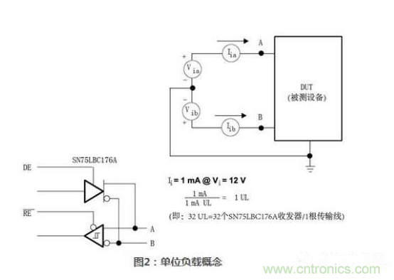 2.1.2單位負載概念掛接在同一485通訊總線上的驅動器和接收器,其最大數量取決于它們的負載特性。驅動器和接收器的負載都是相對單位負載而衡量的。485標準規定一根傳輸總線上最多可以掛接32個單位負載。單位負載定義為:在12V共模電壓環境中,允許通過穩態負載1mA電流,或者是在-7V共模電壓環境中,允許通過穩態負載0.8mA電流。單位負載可能由驅動器、接收器和失效保護電阻組成,但不包括AC終端匹配電阻。