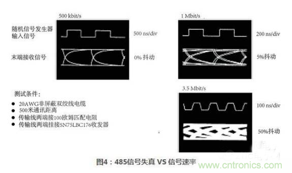 確定隨機噪聲、抖動、失真等對信號影響程度的最簡單方法是使用眼圖。圖4顯示使用20AWG雙絞線電纜500米處、不同信號速率下,接收端的信號失真情況。當信號速率進一步增加,抖動的影響變得更加顯著。在1Mbit/s時,抖動大約為5%,而在3.5Mbit/s時,信號開始徹底被淹沒,傳輸質量嚴重降級。在實際系統中,可允許的最大抖動一般要小于5%。