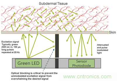 這種心率檢測設計不需要額外的LED,因為LED和光電管都集成在模組內部了,而該模組可以直接安裝在光學界面的下面,亦即諸如智能手表等可穿戴產品的后蓋里面。這種頗具優勢的方法使LED與光電管之間的距離短于分離器件設計,這種更短的距離支持極低功耗的運行,這是因為在穿透皮膚時的光損失更低。
