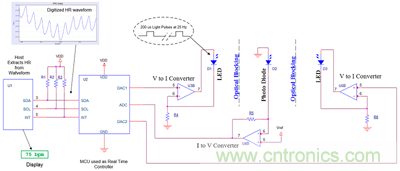 如圖2所示,在一個光電心率系統設計中,難以實現和成本很高的功能模塊分別是:快速的、大電流的驅動LED的電壓到電流轉換器,用于光電管的電流到電壓轉換器,以及運行算法和對序列信號進行處理的MCU。一個可被設置到低至2mA的很低電流,但同時仍然能產生短至10µs的非常窄的光脈沖低噪聲(75 - 100 dB SNR)300mA LED驅動器也是一個用分離器件實現起來非常昂貴的模塊。
