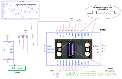 圖3以Silicon Labs的Si118x光學傳感器為例來說明電路原理,基于此器件可以相對方便地實現心率檢測設計。工程師只需專注于設計的光學部分,其中包括電路板上各部分間的光學單元和將該系統如何與皮膚配合。