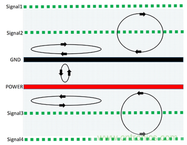 (1)由于信號層與回流參考平面相鄰,S1、S2、S3相鄰地平面,有最佳的磁通抵消效果,優選布線層S2,其次S3、S1。