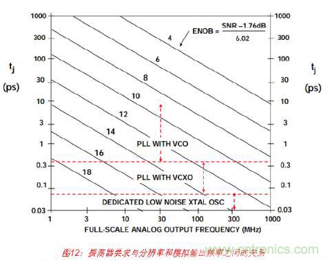 圖12顯示的是與圖10相同的數據,但其中針對各種分辨率要求繪制出與模擬輸出頻率成 函數關系的最大允許抖動。根據最大輸出頻率和ENOB中所需分辨率來選擇采樣時鐘發生 器類型,應以此圖片作為大概準則。具有標準VCO的PLL方法就是產生采樣時鐘的一種 不錯方式,其中均方根(RMS)抖動要求大約為1 ps或以上。不過,亞皮秒抖動要求采用基 于VCXO的PLL或專用低噪聲晶體振蕩器。“教程MT-008”介紹了如何將振蕩器相位噪聲轉 換成抖動。