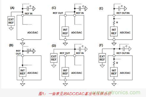 各種各樣的ADC和DAC以各種各樣的方式支持使用外部基準電壓源來替代內部基準電壓源。圖1所示為一些常見配置(但顯然并不是全部)。