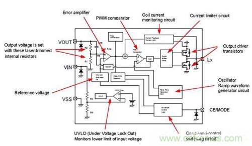 內(nèi)部電路由基準電壓、誤差放大器、振蕩器、指示燈波形、PWM比較器、UVLO、限定電流電路等構成,固定輸出電壓型由激光微調(diào)固定調(diào)整了內(nèi)部電阻R1/R2的電阻比。工作電壓范圍在1.8V~6V之間。此外,內(nèi)部調(diào)整了放大器的相位補償及送信頻率、軟啟動時間等,可以完全無須調(diào)整地使用。