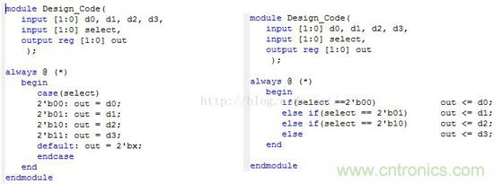 設計一個二位4路選擇器,由于選擇器使用條件觸發(fā)的方法對應真值表進行匹配輸出與輸入,因此可以聯想到在C程序設計中的條件語句“If”和“Case”兩種,那么這兩種設計從硬件的角度出發(fā)有什么不同呢?