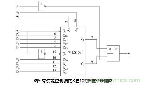 也可以添加使能控制端對所接成的8選1數據選擇器的工作狀態(tài)進行控制。添加使能控制端的8選1數據選擇器的電路如圖5所示。