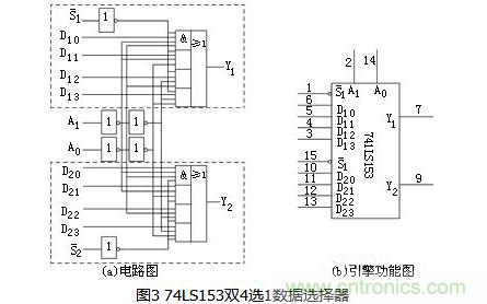 74LS153是一種集成的雙4選1數據選擇器邏輯器件。圖3所示為74LS153的邏輯電路圖和框圖。