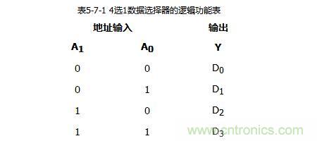 常用的多路選擇器有4選1、8選1、16選1等多種類型。下面以4選1數據選擇器為例介紹數據選擇器的工作原理。根據前面介紹的數據選擇器的功能,可以列出4選1數據選擇器的邏輯功能表,如表5-7-1所示。其中D0~D3為數據輸入端,A0、A1為數據選擇端。