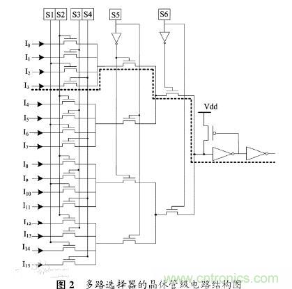 多路選擇器的左邊是 16 條輸入線,用于連接布線軌道或可編程邏輯塊等資源,S1~S6 代表 6 個可編程SRAM 單元,通過配置 SRAM 單元的內容可以從 16條輸入線中選出 1 條作為有效輸入端,例如,當 S1~S6存儲單元的存儲值為“000100”時,輸入線 I3被選擇中,信號所經過的有效路徑如圖 2 中虛線所示。多路選擇器的主體部分是傳輸晶體管,由于 NMOS 晶體管載流子的遷移效率高,電路速度快,因此,多路選擇器中的傳輸晶體管均采用 NMOS 晶體管實現。