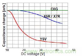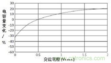 由于I類MLCC以順電材料組成,它的電容不會因交流電壓轉變而變化,但II類MLCC電容是隨著交流電壓的增加而變化。在II類MLCC中,Y5V顯示交流電壓的變化比X5R/X7R更嚴重,這是由于鐵電材料的電壓對極化曲線的非線性特性。