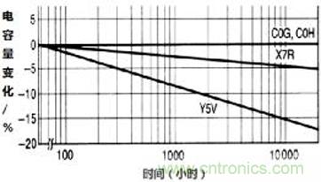II類MLCC的電容量隨室溫中長時間放置呈對數關系減少,但I類MLCC由順電性質的材料組成而不會有老化現象。老化本質上是可逆的,但元件的老化是不能阻止的。在MLCC的試驗性能前,我們需要進行熱處理。即通過在居里點以上加熱(150℃至少1小時)并冷卻至室溫,將MLCC晶體結構恢復到其最佳的無序排列,從而實現最大電容量。