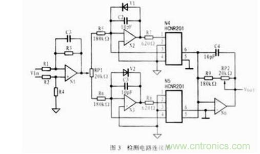 在實際檢測電路的某一采集信道中,如需對一組差動輸入信號進行檢測,可將電路接成如圖3所示的連接方式。圖中,通過放大器N1可將輸入的差動信號變?yōu)閱芜呅盘柡筝敵觥S捎诙O管V1和V2的作用,當輸入信號為正時,V2導通,V1截止,放大器N2呈開環(huán)狀態(tài),光耦N5工作,N4關斷;而當輸入信號為負時,則正好相反。當HCNR201的第3、4端的光敏二極管受光后,其輸出信號將反饋到放大器的輸入端,以提高光耦的線性并減少溫漂。第5、6端輸出的信號經運放放大后輸出。電位器RP1的作用是調節(jié)運放輸入偏置電流的大小。電容C2、C3為反饋電容,可用于提高電路的穩(wěn)定性,消除自激振蕩,濾除電路中的毛刺信號,降低電路的輸出噪聲,其容值可根據電路的頻率特性來選取。放大器N6的作用是把光耦輸出的電流信號轉變?yōu)殡妷盒盘栆怨┖蠹夒娐肥褂茫⒃鰪娯撦d驅動能力,降低輸出阻抗。調整電阻RP2的值可以調整信道的增益。