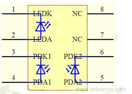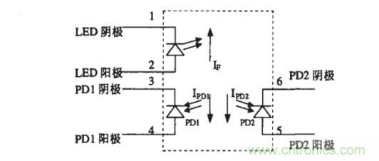 HCNR200/201包括一只高性能的發(fā)光二極管(圖中的LED),兩只極其相似的光電二極管(圖中的PD1和PD2)。當LED中流過電流If時。其發(fā)出的光會在PD1和PD2中感應出正比于LED發(fā)光強度的光電流Ipd1和Ipd2。由于PD1和PD2的特性非常相似,再加上安裝位置的精確性以及元件先進的封轉設計保證了該元件的高線性度和增益的穩(wěn)定性。