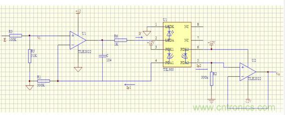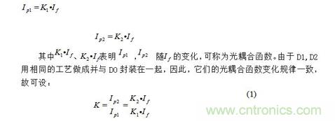 電容C防止電路產生震蕩。TIL300內部DO是發(fā)光二極管,其工作電流電If可選為10mA。D1,D2為光敏二極管,他們受DO的激發(fā)分別產生電流IP1和Ip2,其大小與If有關: