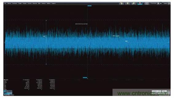 測(cè)量參數(shù)可以應(yīng)用于圖2中的噪聲波形,以深入了解這種噪聲信號(hào)的特性。圖中顯示的參數(shù)有平均值、標(biāo)準(zhǔn)偏差和峰峰值。顯示器下方顯示了讀取的參數(shù)值。