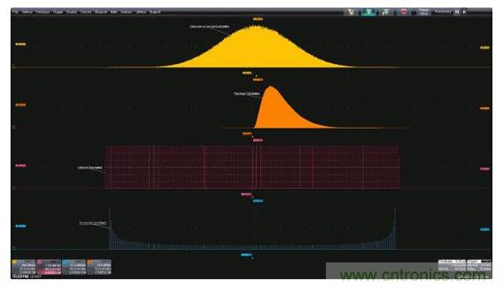 在許多應(yīng)用中,兩個(gè)或多個(gè)隨機(jī)過(guò)程可能發(fā)生交互。當(dāng)這種情況發(fā)生時(shí),過(guò)程的概率密度會(huì)進(jìn)行數(shù)學(xué)卷積運(yùn)算。一個(gè)常見(jiàn)的例子是結(jié)合了隨機(jī)和確定性抖動(dòng)分量的時(shí)序抖動(dòng)。圖5顯示了結(jié)合在一起的高斯和正弦分量,源分布位于上面兩張圖,從上往下數(shù)的第三張分布圖是兩個(gè)源卷積的結(jié)果。許多先進(jìn)的示波器提供可選的抖動(dòng)或噪聲分析包,這些分析包可以將這些組合式分布分開(kāi),單獨(dú)測(cè)量分量。