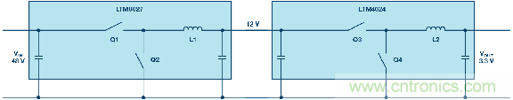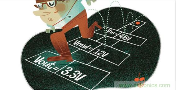 圖2.電壓分兩步從48 V降至3.3 V,包括一個12 V中間電壓。