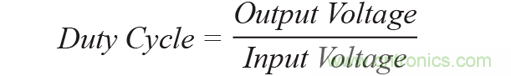 如果將一個降壓轉換器(降壓器)用于此單一轉換步驟,如圖1所示,會出現小占空比的問題。占空比反映導通時間(當主開關導通時)和斷開時間(當主開關斷開時)之間的關系。降壓轉換器的占空比由以下公式定義: