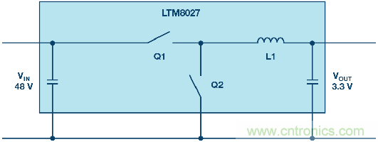 圖1.通過單一轉換步驟將電壓從48 V降至3.3 V。