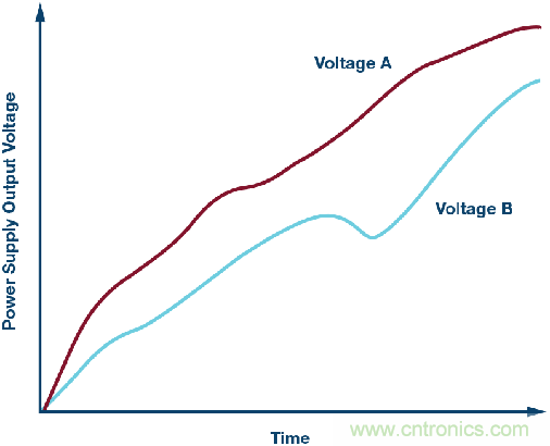 除了電壓時(shí)序之外,啟動(dòng)過程中還可能要求電壓單調(diào)上升。這意味著電壓僅線性上升,如圖4中的電壓A所示。此圖中的電壓B是電壓非單調(diào)上升的例子。在啟動(dòng)過程中,當(dāng)電壓上升到一定電平時(shí)負(fù)載開始拉大電流,就會(huì)發(fā)生這種情況。防止這種情況的一種辦法是延長電源的軟啟動(dòng)時(shí)間,并選擇能夠快速提供大量電流的電源轉(zhuǎn)換器。
