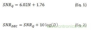 例如,要使抽取因子為2,必須讓信號的過采樣因子至少為2。在這個例子中,信號功率保持不變,但奈奎斯特帶寬被減半。這就消除了一半的噪聲功率,從而讓該ADC的SNR增加了3dB。第一個方程式表示因量化噪聲得到的理想SNR,其中N是該轉(zhuǎn)換器的位數(shù)。第二個方程式則表示與抽取因子D相關(guān)的SNR改善值。
