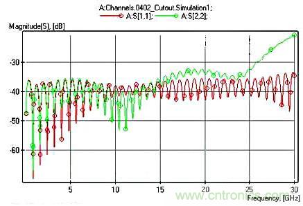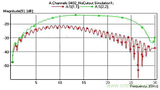 圖7圖8對比,在用ROGERS板材做隔層處理之后,相比未做隔層處理回波損耗下降到-30dB之內,大大降低了回波損耗,保證了信號傳輸的完整。
