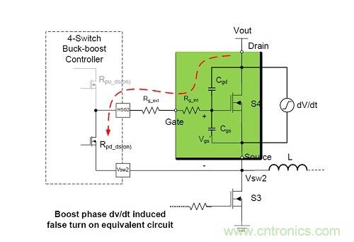 然后,這一問題在4開關(guān)降壓-升壓轉(zhuǎn)換器中翻了一番,因?yàn)樗袃蓚€(gè)階段——降壓和升壓。當(dāng)設(shè)計(jì)人員直接將降壓轉(zhuǎn)換器的電路參數(shù)復(fù)制到4開關(guān)降壓-升壓轉(zhuǎn)換器的升壓段時(shí),就會(huì)產(chǎn)生錯(cuò)誤。隨著這種拓?fù)浣Y(jié)構(gòu)在應(yīng)用中越來越受歡迎,了解dv/dt電感導(dǎo)通問題變得越來越重要。