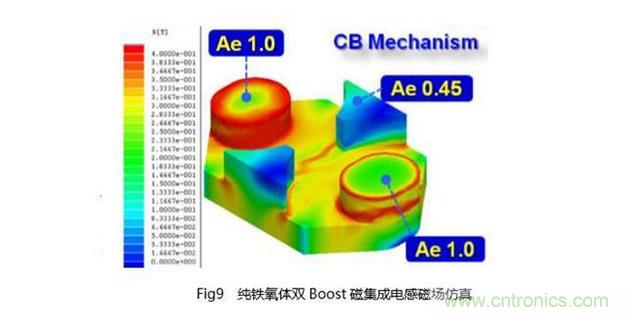 圖9為該電感在上述條件下,讓左邊線圈電流最大,使磁芯接近飽和的仿真結果。從圖中可以明顯看出,即便兩邊的磁芯接近飽和,中間公共部分磁芯的截面雖小,卻仍遠離飽和。此時磁芯即便是處于高頻工作狀態,中間磁芯柱上的ΔB非常小,這部分磁芯的損耗自然也很低。