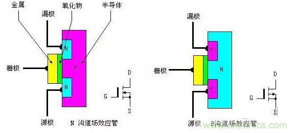 功率MOSFET的內(nèi)部結構和電氣符號如圖所示,它可分為 NPN型和PNP型。NPN型通常稱為N溝道型,PNP型通常稱P溝道型。由圖1可看出,對于N溝道型的場效應管其源極和漏極接在N型半導體上,同樣對于P 溝道的場效應管其源極和漏極則接在P型半導體上。我們知道一般三極管是由輸入的電流控制輸出的電流。但對于場效應管,其輸出電流是由輸入的電壓(或稱場電壓)控制,可以認為輸入電流極小或沒有輸入電流,這使得該器件有很高的輸入阻抗,同時這也是我們稱之為場效應管的原因。