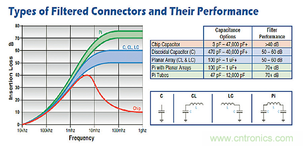 圖2還顯示了各種濾波器類型以及簡單芯片電容濾波器的相對濾波器性能。從這些數據可以看出,芯片電容的作用與前面提到的陷波濾波器相似,而C、CL、LC和Pi濾波器由平面陣列、盤狀電容器或陶瓷管構成,可提供更好的寬頻率和更高的濾波器性能總體水平。