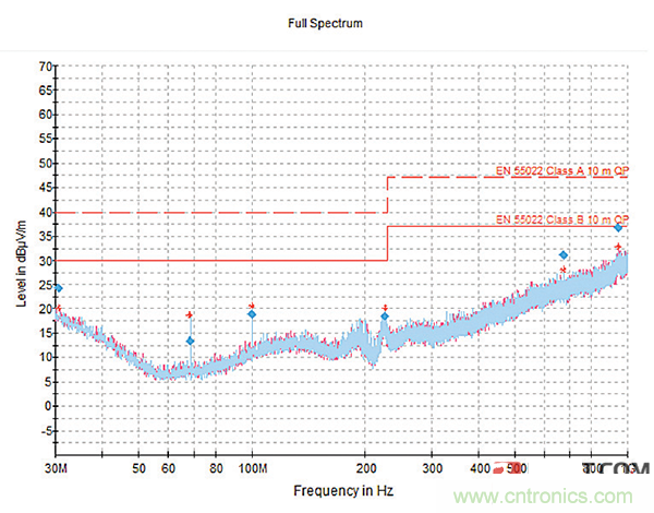 這種濾波器插入設計提供了最大的屏蔽效能,并使等效串聯電感最小化,為芯片電容器提供可用的最佳性能,同時還利用了系統中已存在的屏蔽。結合專用的22000pF濾波器,濾波器插入實現了圖10所示的結果,從而以具有成本效益的長期解決方案來滿足EMC法規。
