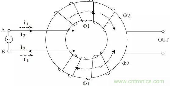 如圖所示,在同一磁環(huán)上繞上兩組方向相反的線圈,據(jù)右手螺旋管定則可知,當(dāng)在輸入端A、B兩端加上極性相反,信號幅值相同的差模電壓時,有實線所示的電流i2,在磁芯中產(chǎn)生實線所示的磁通Φ2,只要保證兩繞組完全對稱,則磁芯中兩不同方向之磁通相互抵消。總磁通為零,線圈電感幾乎為零,對常模信號無阻抗作用。若在輸入端A、B兩端加上極性相同,幅值相等的共模信號時,有虛線所示的電流i1,在磁芯中產(chǎn)生虛線所示的磁通Φ1,則磁芯中磁通有相同的方向而互相加強(qiáng),使每一線圈的電感值為單獨(dú)存在時的兩倍,而XL =ωL,因此,此一繞法的線圈對共模干擾有很強(qiáng)的抑制作用。