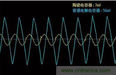 其優點主要有兩個。一是能削減貼裝面積。因為片狀多層陶瓷電容器單位體積的靜電容量較大。另一個是用于DC-DC轉換器等輸出平滑電路時,可降低輸出紋波電壓。原因在于片狀多層陶瓷電容器的等效串聯電阻(ESR:Equivalent Series Resistance)較低。如圖1所示,使用鉭電解電容器時,輸出紋波電壓為56mV,而使用片狀多層陶瓷電容器時則降到了7mV。