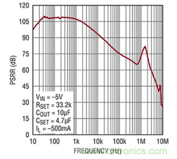 圖2:該圖顯示高性能LDO的PSRR頻率響應(yīng):在1kHz時(shí),良好LDO的基準(zhǔn)值介于60dB至110dB之間。(圖片來源:Analog Devices)