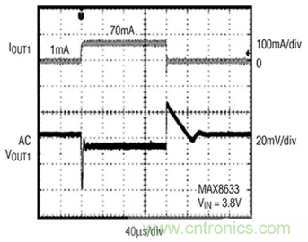 圖3:對輸出負(fù)載快速變化的瞬態(tài)電壓響應(yīng)是無線傳感器應(yīng)用的LDO關(guān)鍵性能指標(biāo)。此處所示為高性能LDO的響應(yīng)。(圖片來源:Maxim Integrated)
