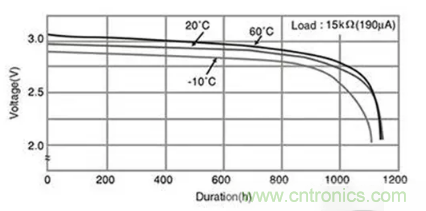 圖5:在190μA的典型無線傳感器平均電流負(fù)載和20°C的工作溫度下,CR2032電池可維持>2.7V電壓1000 小時(shí)。(圖片來源:Panasonic)