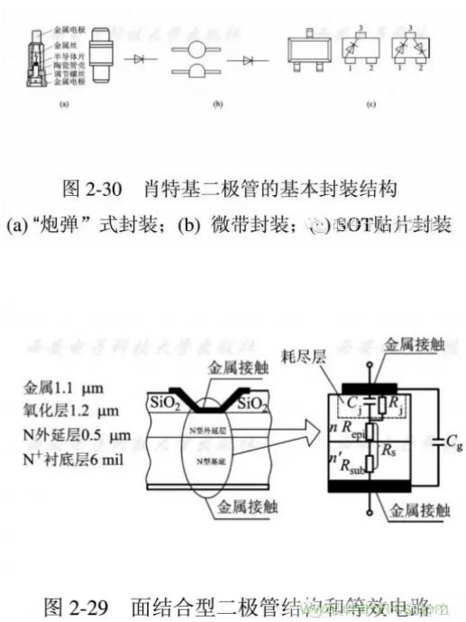 因此性能穩(wěn)定,一致性好,不易損壞。圖中給出一種面結(jié)合型二極管的結(jié)構(gòu)圖和等效電路。從中可以看出各部分的結(jié)構(gòu)尺寸量級。通常這種管芯要進行封裝才能方便地使用。肖特基勢壘二極管的典型封裝結(jié)構(gòu)可采用“炮彈”式、微帶式、SOT貼片式等如圖2-30所示。