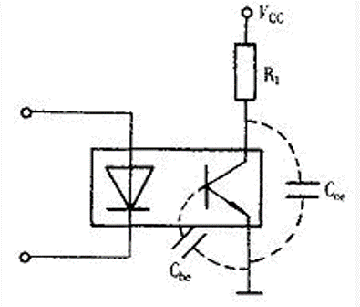 由于光耦自身存在的分布電容,對傳輸速度造成影響,光敏三極管內部存在著分布電容Cbe和Cce,如圖4所示。由于光耦的電流傳輸比較低,其集電極負載電阻不能太小,否則輸出電壓的擺幅就受到了限制。但是,負載電阻又不宜過大,負載電阻RL越大,由于分布電容的存在,光電耦合器的頻率特性就越差,傳輸延時也越長。