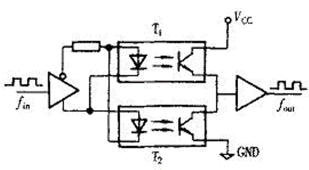 用2只光電耦合器T1,T2接成互補推挽式電路,可以提高光耦的開關速度,如圖5所示。當脈沖上升為“1”電平時,T1截止,T2導通。相反,當脈沖為“0”電平時,T1導通,T2截止。這種互補推挽式電路的頻率特性大大優于單個光電耦合器的頻率特性。