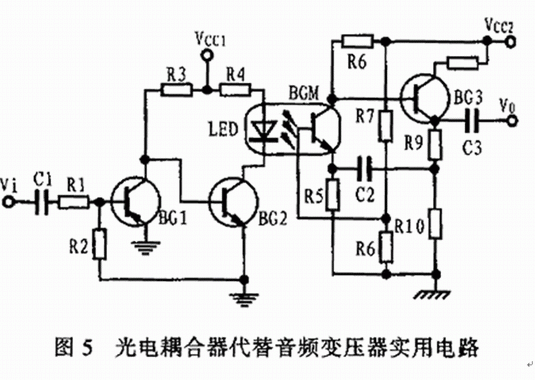 目前,利用光電耦合器代替音頻變壓器的應(yīng)用電路有多種形式,圖5所示是比較實用的一種。當(dāng)輸入信號Vi經(jīng)三極管BG1、BG2前級放大之后,驅(qū)動光電耦合器左邊的LED發(fā)光,并被右邊的光敏管全部吸收并轉(zhuǎn)換成電信號,此信號經(jīng)后級電路BG3放大,并由該管的發(fā)射極通過電容器C3后輸出一個不失真的放大信號 V0。由于該電路將前后兩級放大器之間完全隔離,因而杜絕了地環(huán)路可能引起的干擾。同時由于該電路還具有消噪功能,因此避免了信號的失真。整個電路的總增益可望達(dá)到20dB以上,帶寬約120kHz。