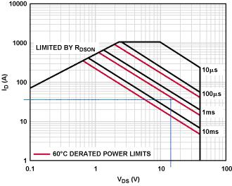 在40 V,降額后的功率所對應的電流為14 A,在SOA圖上這點將確定新的62°C降額后的1 ms線。使用同樣的辦法可確定新的10 ms以及100 μs線。新線在圖6中以紅色示出。