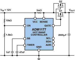 這個問題可通過熱插拔控制器(圖1)來解決,熱插拔控制器能合理控制浪涌電流,確保安全上電間隔。上電后,熱插拔控制器還能持續監控電源電流,在正常工作過程中避免短路和過流。