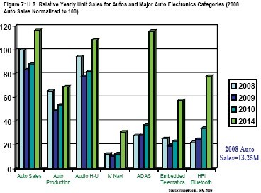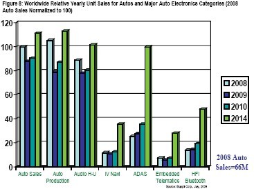 每個領域中的銷售態勢都很相似,在2009年下降,在之后的幾年增長。ADAS在2009年略有增長,它包括五個領域:超聲波與攝像頭泊車輔助,適應性巡航控制,車道偏離警告與盲點探測系統。藍牙HFI系統的銷售在2009年也實現了增長,主要是因為這種系統在所有地區都具有較高的可獲得性。