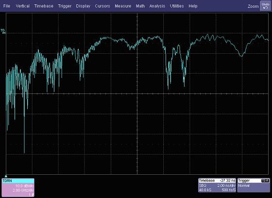 回波損耗或S11 是頻域的測量和反射系數(shù)有關(guān)。歸一化(通過反射平面校準(zhǔn) 基線校正)反射系數(shù)的傅里葉變換給出了回波損耗是頻率的函數(shù)。圖2給出了USB 3.0線纜和連接器測量的結(jié)果。圖中的橫軸表示2GHz/div,范圍是0~20GHz,縱軸表示10dB/div。回波損耗在2GHz大約是15dB,但隨著頻率的增加開始變得越來越小。精細(xì)的空值間隔是由線纜末端的連接器引起的,較大的空值間隔是由于連接器內(nèi)部的阻抗結(jié)構(gòu)決定的。