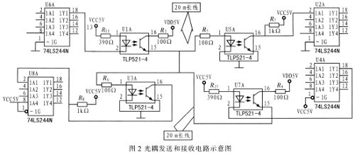采用光電隔離器TLP521-4對發(fā)送和接收設(shè)備進(jìn)行電氣隔離,對于減小交流阻抗的作用十分明顯,進(jìn)而增大傳輸電流,有效地抑制地線噪聲;同時(shí)由于74LS244N的應(yīng)用。總線驅(qū)動(dòng)能力得到保障。圖2為光耦發(fā)送和接收電路示意圖。圖2中,上半部兩光耦自左向右傳輸信號,下半部兩光耦自右向左傳輸信號,左端74LS244N通過靜態(tài)存儲器IDT7132與處理器進(jìn)行數(shù)據(jù)交換,右端通過8255與處理器進(jìn)行數(shù)據(jù)交換。